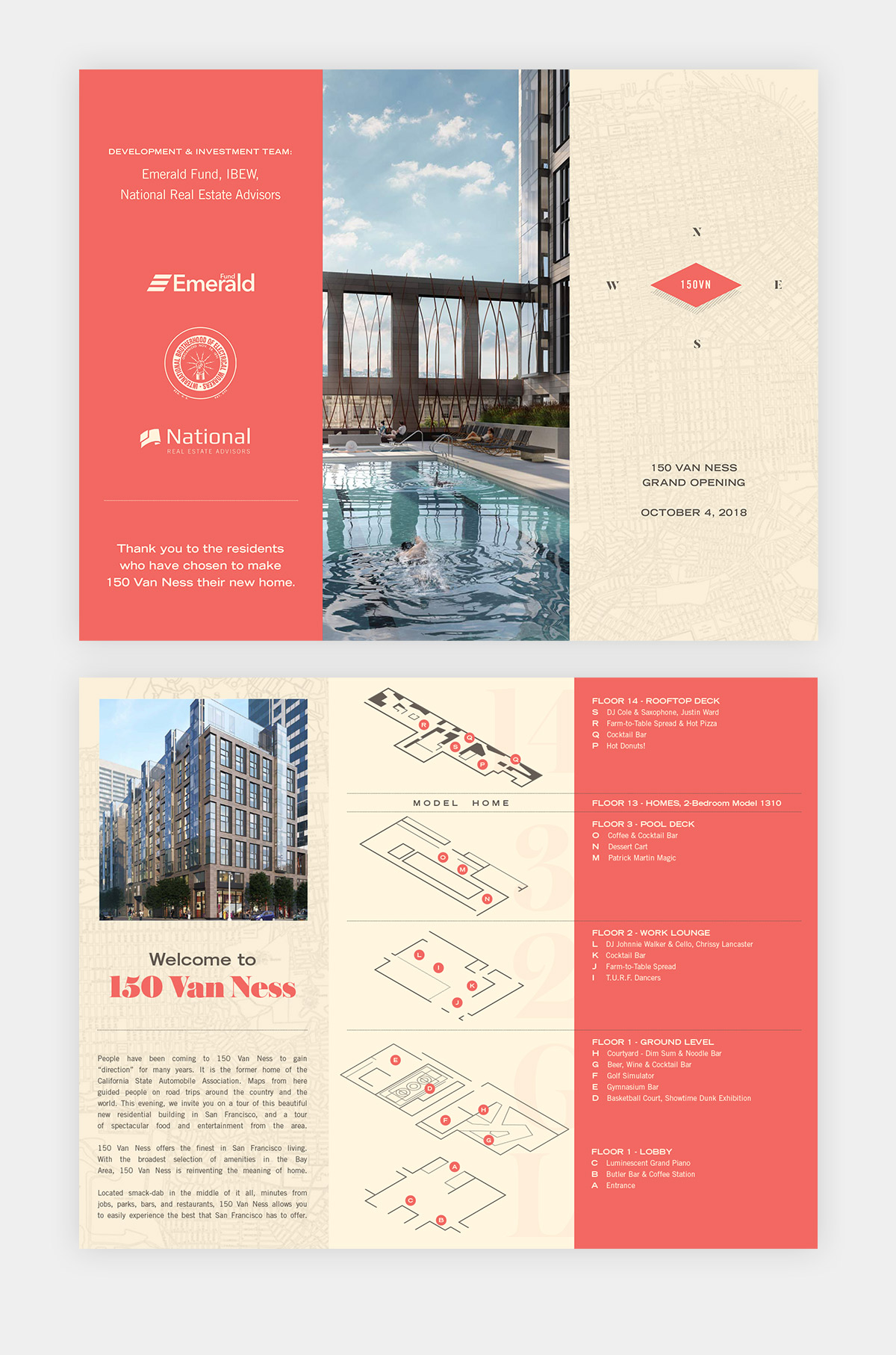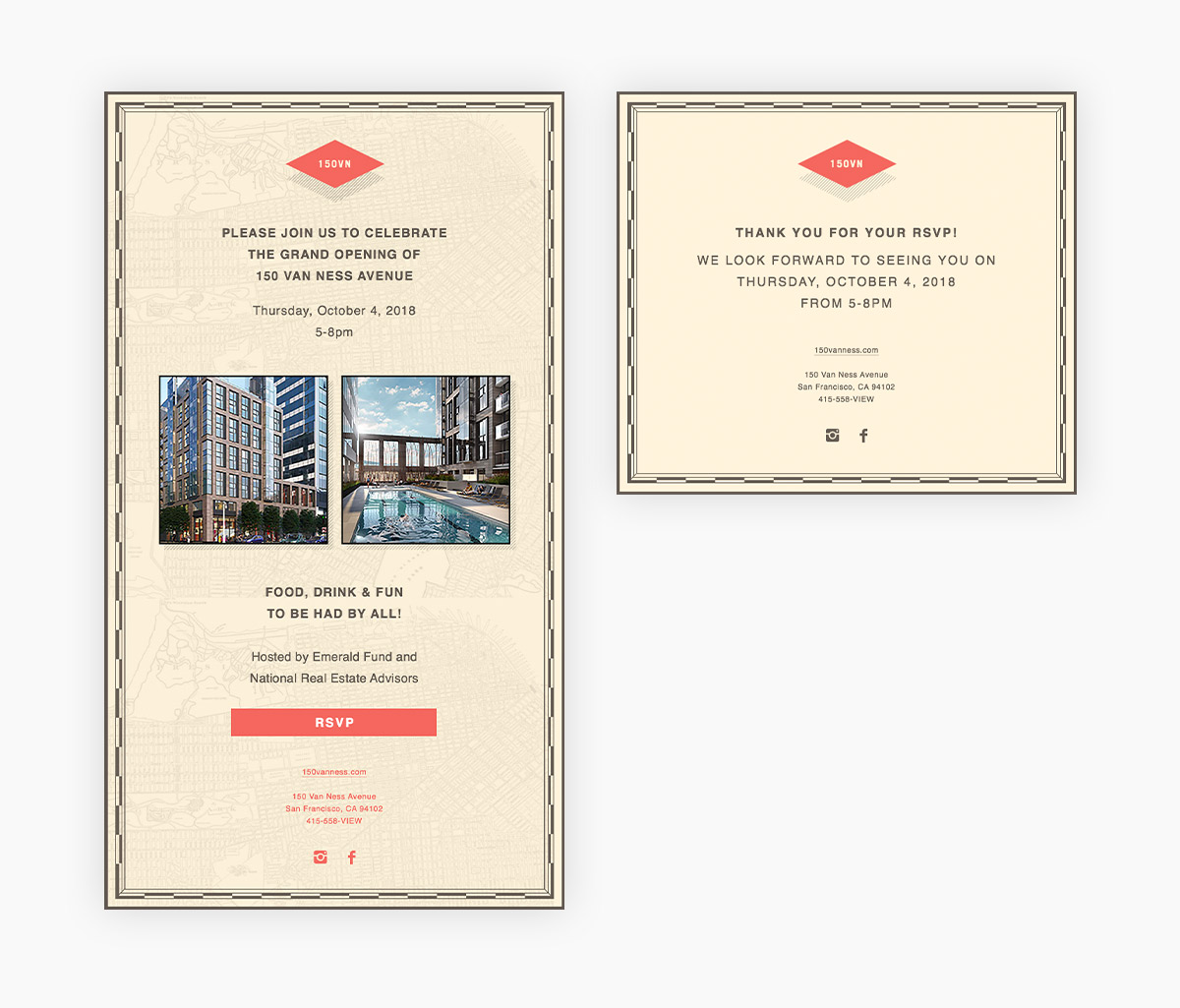 150 Van Ness needed a fun way to celebrate their new residential building opening party. Drawing on the building's history as an old AAA office, I created a design system inspired by old California maps to create a fun experience for the guests.